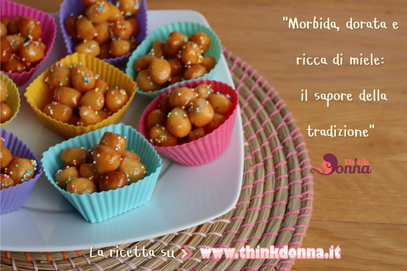 Se nonna le faceva piccolissime e croccanti, io le preferisco un po' pių gonfie e morbide, ma sempre letteralmente sommerse nel miele, come le fa la mia mamma, che ora, diventata nonna Caterina, le prepara per i suoi 5 nipoti.