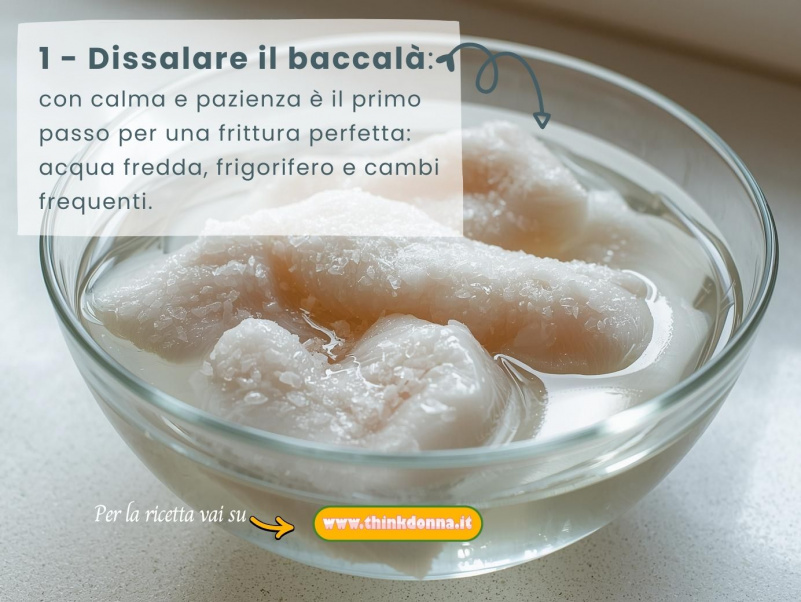 Questa fase è essenziale per ottenere un baccalà fritto perfetto, non salato e delicato.