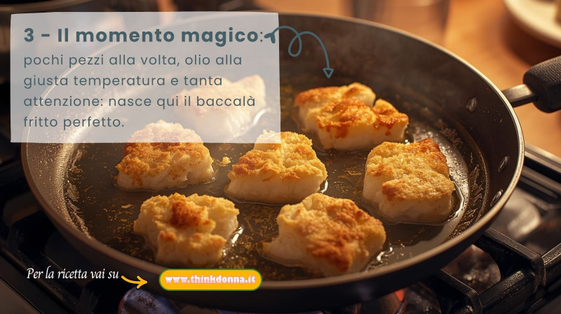 - Immergi i pezzi di baccalà nella pastella, assicurandoti che siano ben ricoperti, e poi tuffali nell'olio caldo, pochi per volta (per non abbassare la temperatura).