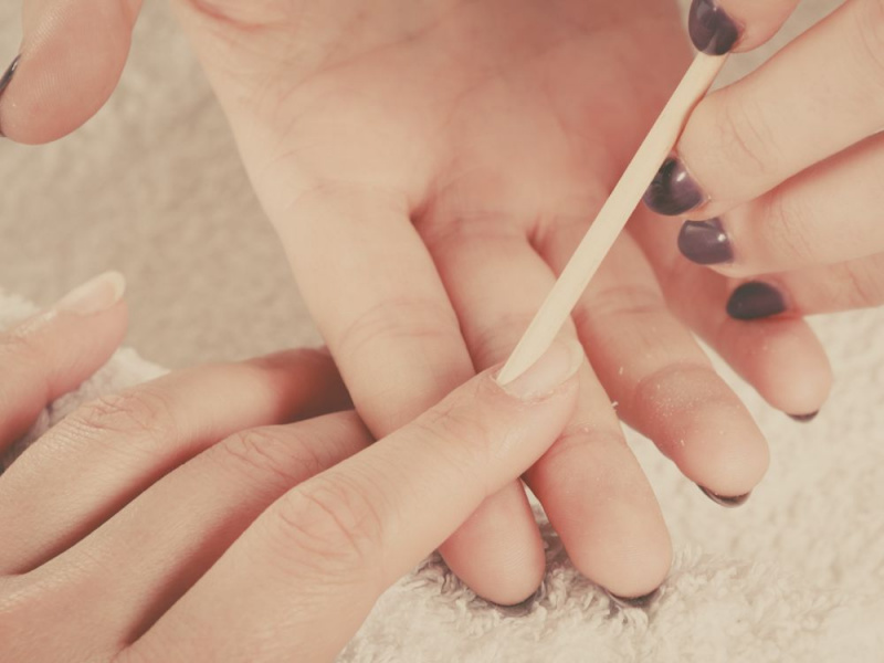 Spingi delicatamente le cuticole con un bastoncino in legno o uno spingicuticole. Se necessario, applica un prodotto emolliente e massaggia.